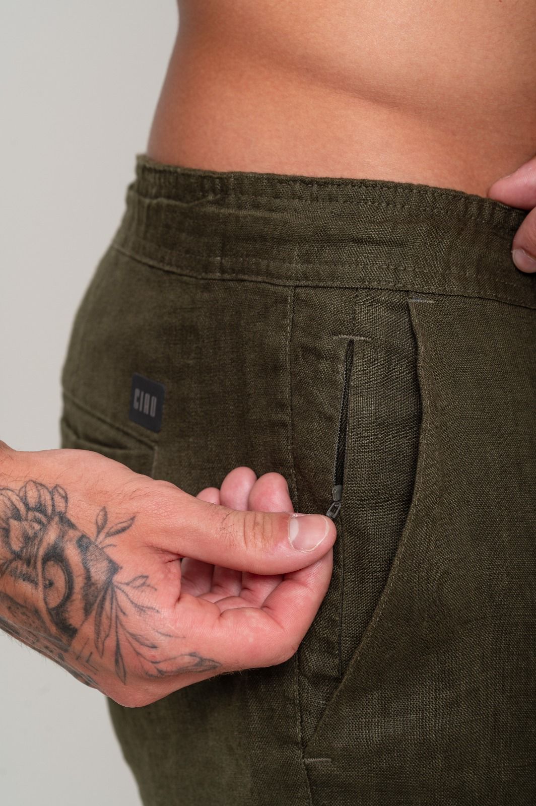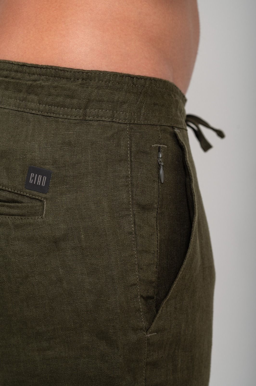 Com cadarço na cintura, bolsos faca e um bolso com zíper invisível, a Santorini é extremamente leve, confortável e com todas as características que o linho proporciona.