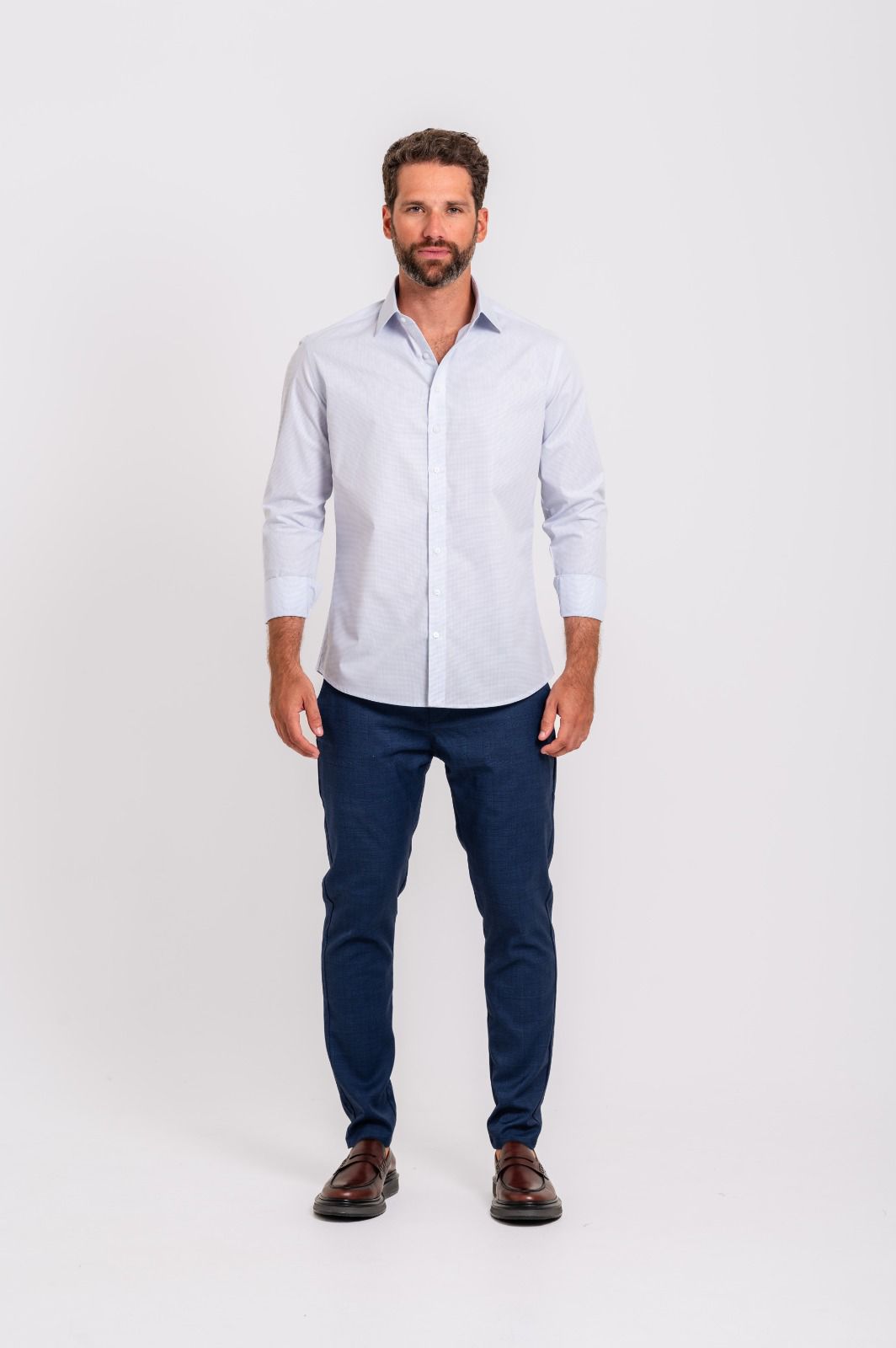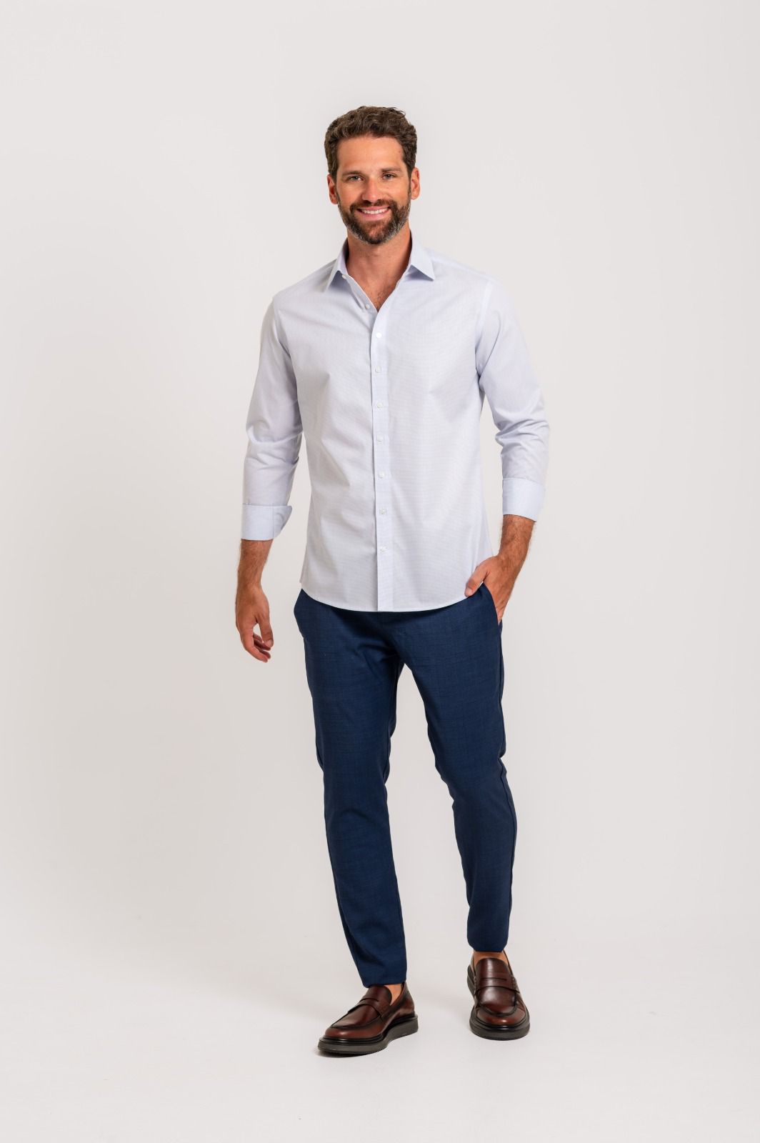 Seu tecido possui leve textura e acabamento sofisticado, trazendo um aspecto mais refinado à peça. A composição com elastano garante mobilidade e conforto ao longo do uso, tornando a Shelby uma escolha versátil — perfeita tanto para produções mais casuais quanto para ocasiões que pedem um visual mais arrumado.