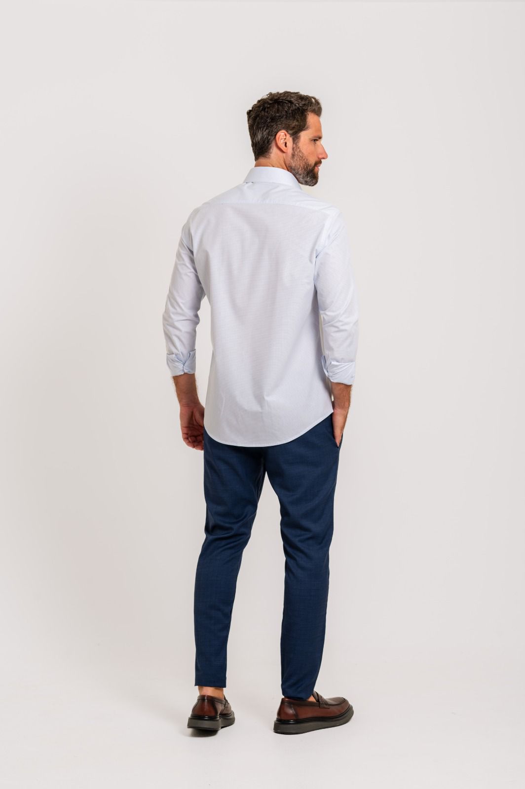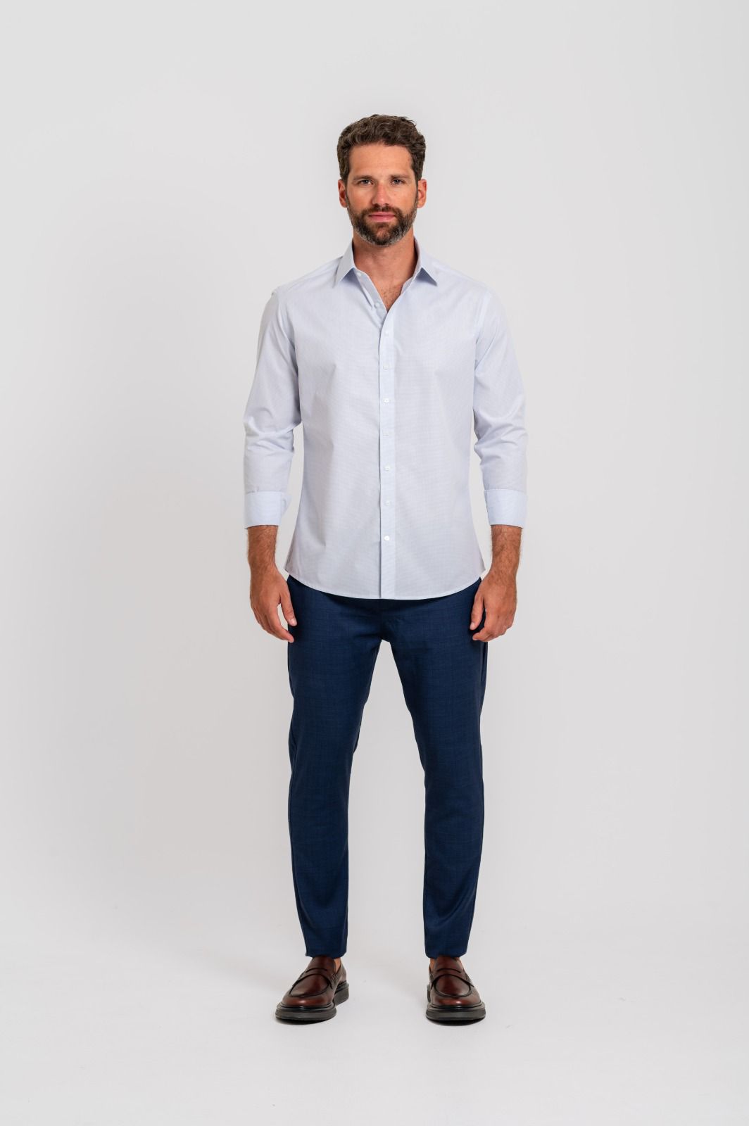 Seu padrão discreto em micro grid traz sofisticação sutil, ideal para composições formais ou para elevar produções mais casuais com naturalidade. O design com colarinho estruturado e acabamento refinado reforça a proposta de uma peça versátil, atemporal e indispensável no guarda-roupa masculino.