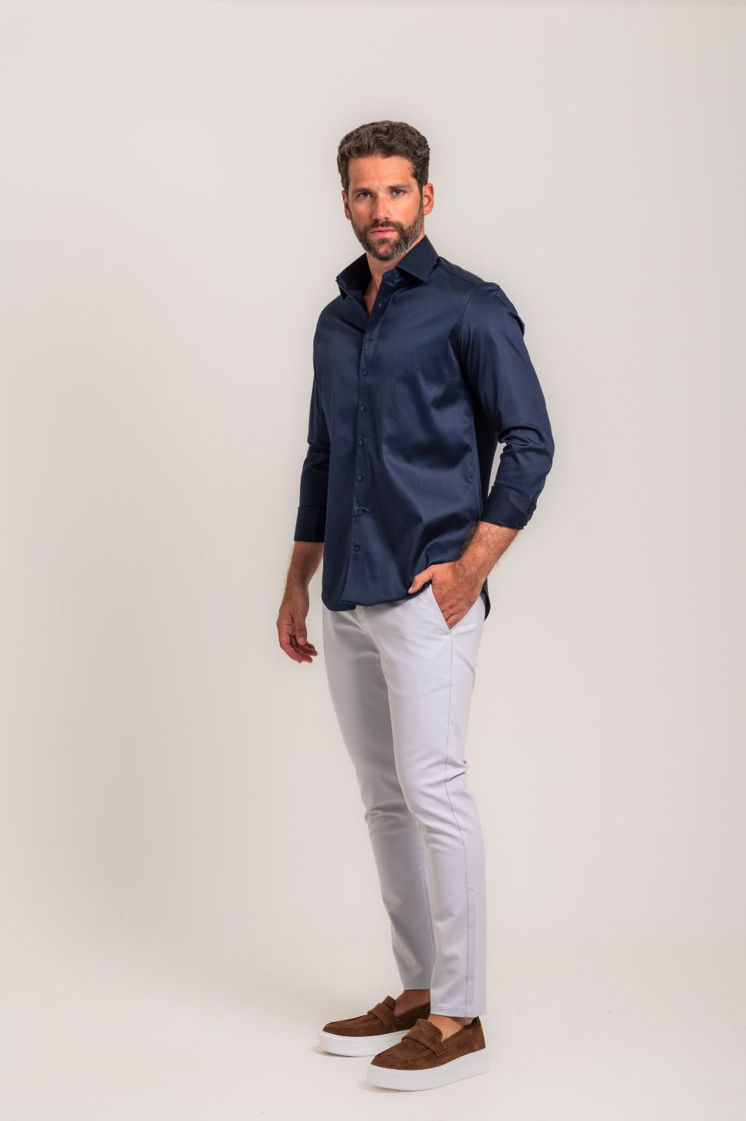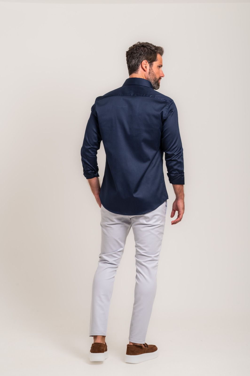 Camisa social de estética italiana, desenvolvida para um caimento impecável e elegante no corpo. Confeccionada em tecido 98% algodão com 2% elastano, oferece conforto, leve flexibilidade e liberdade de movimento no dia a dia.