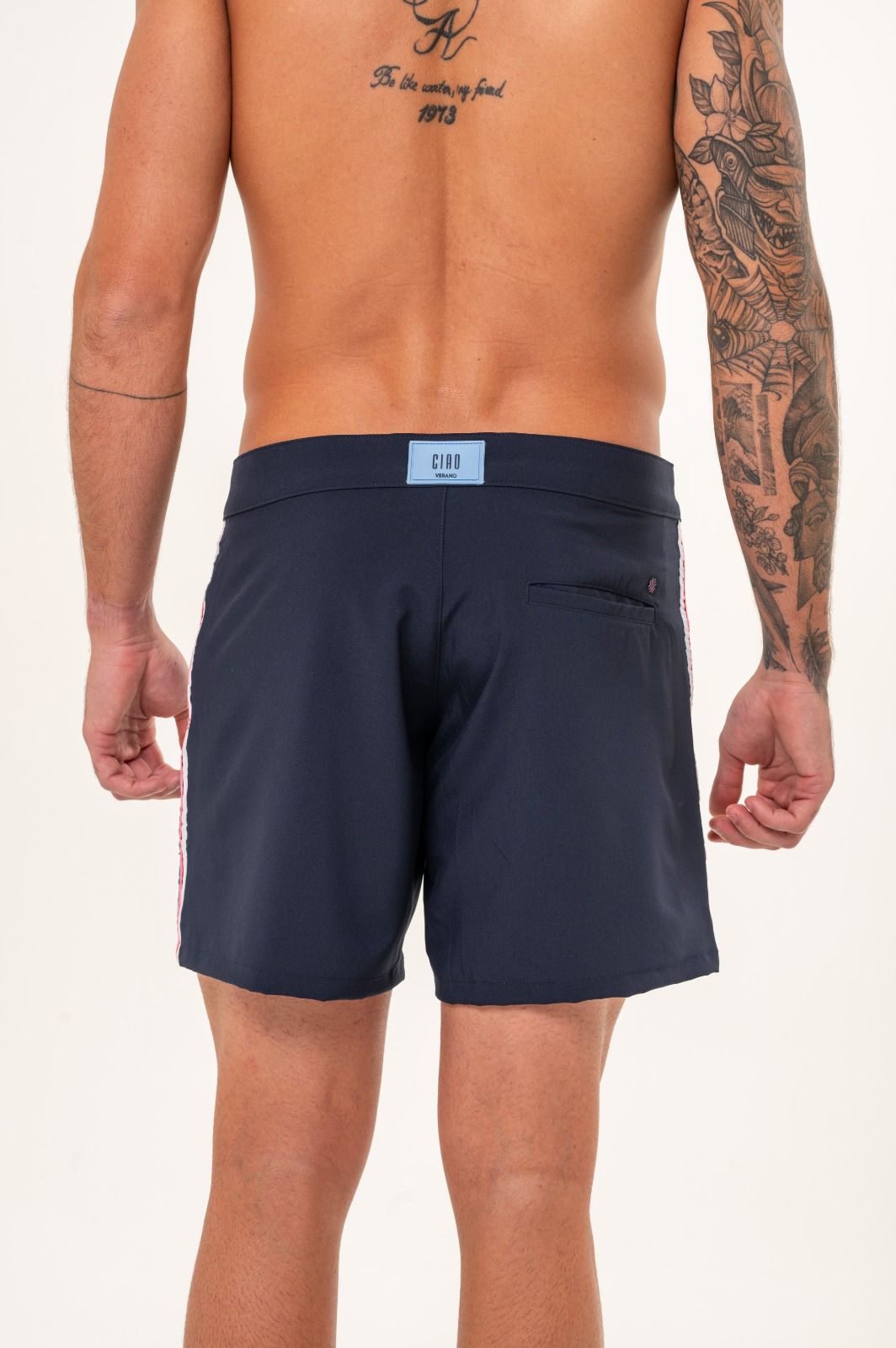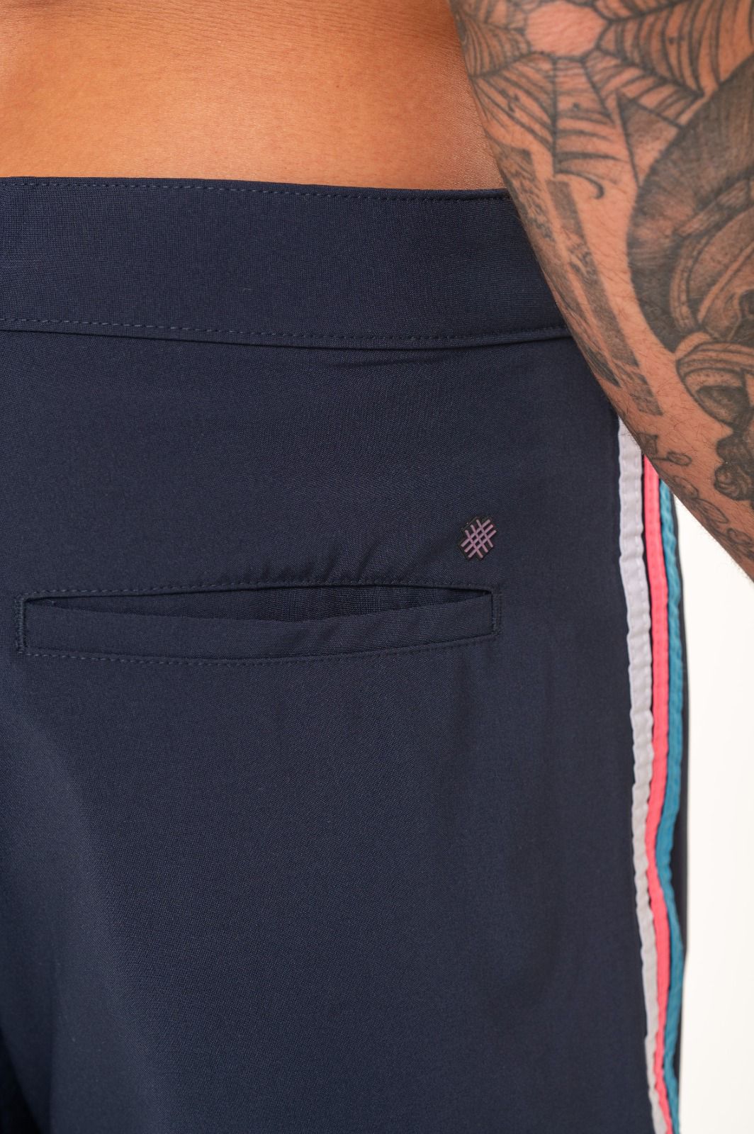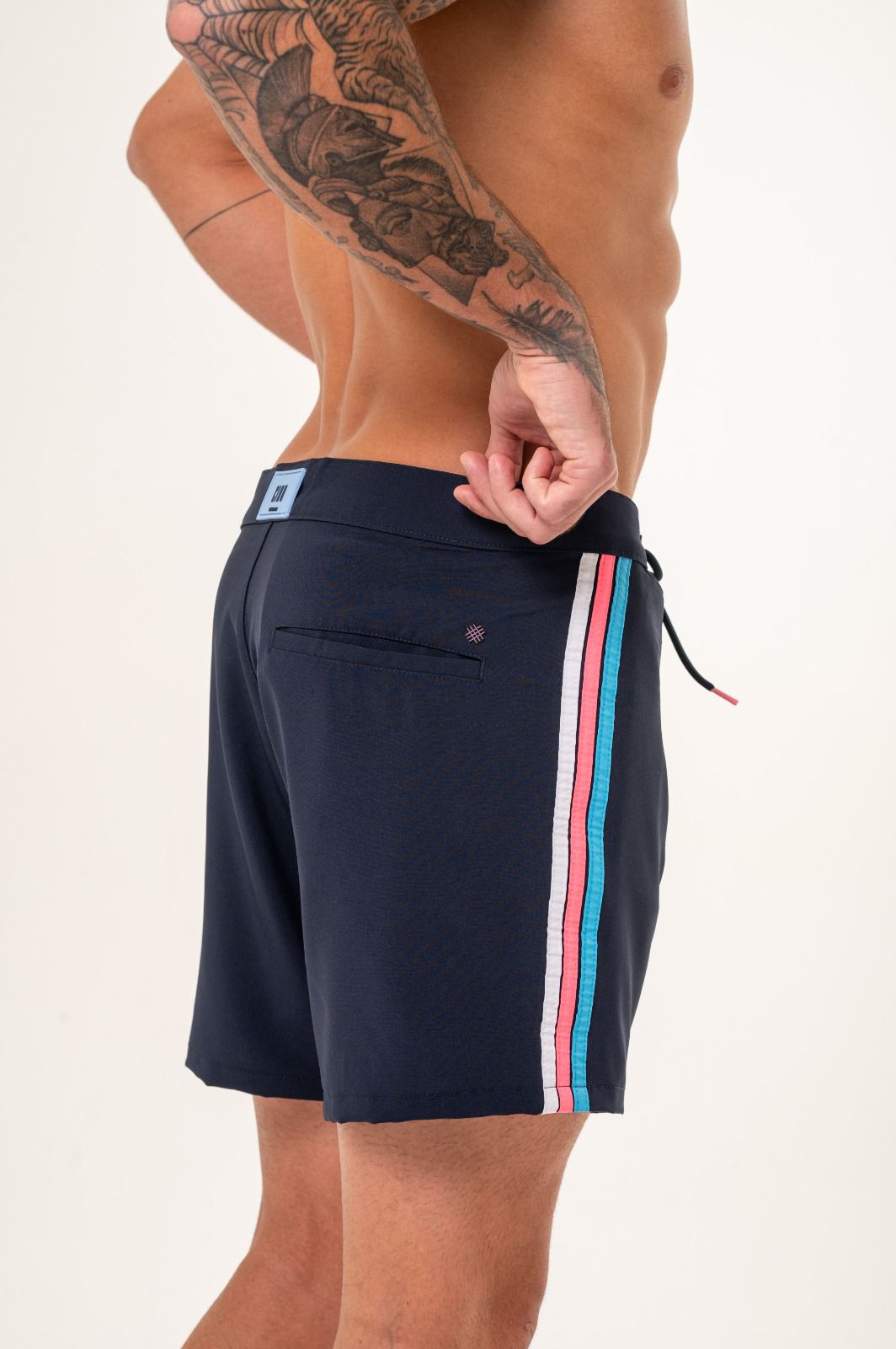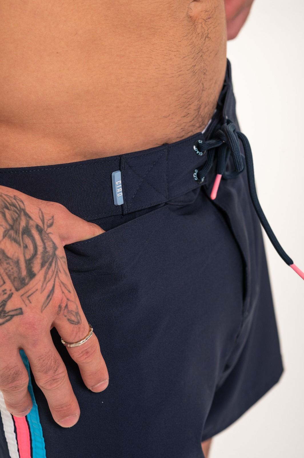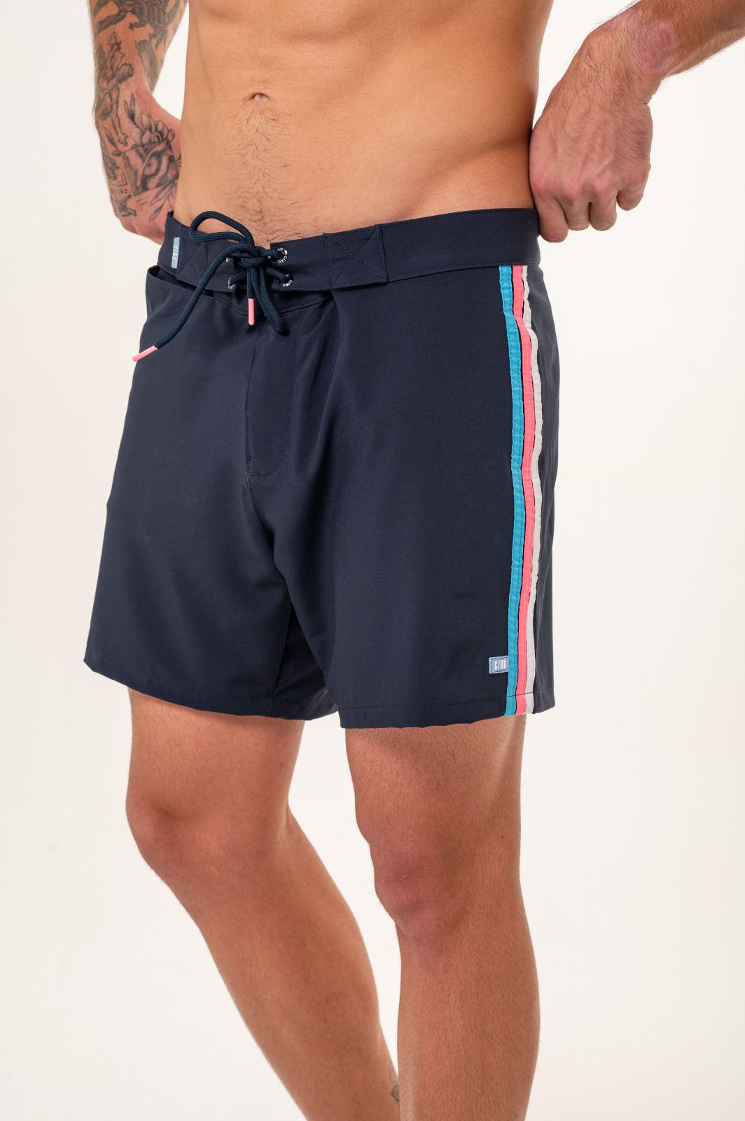 O Short Malibu une conforto, estilo e personalidade na medida certa. Em tom azul marinho, ele ganha destaque com as listras laterais em azul, rosa pink e branco que trazem um toque moderno e esportivo à peça.