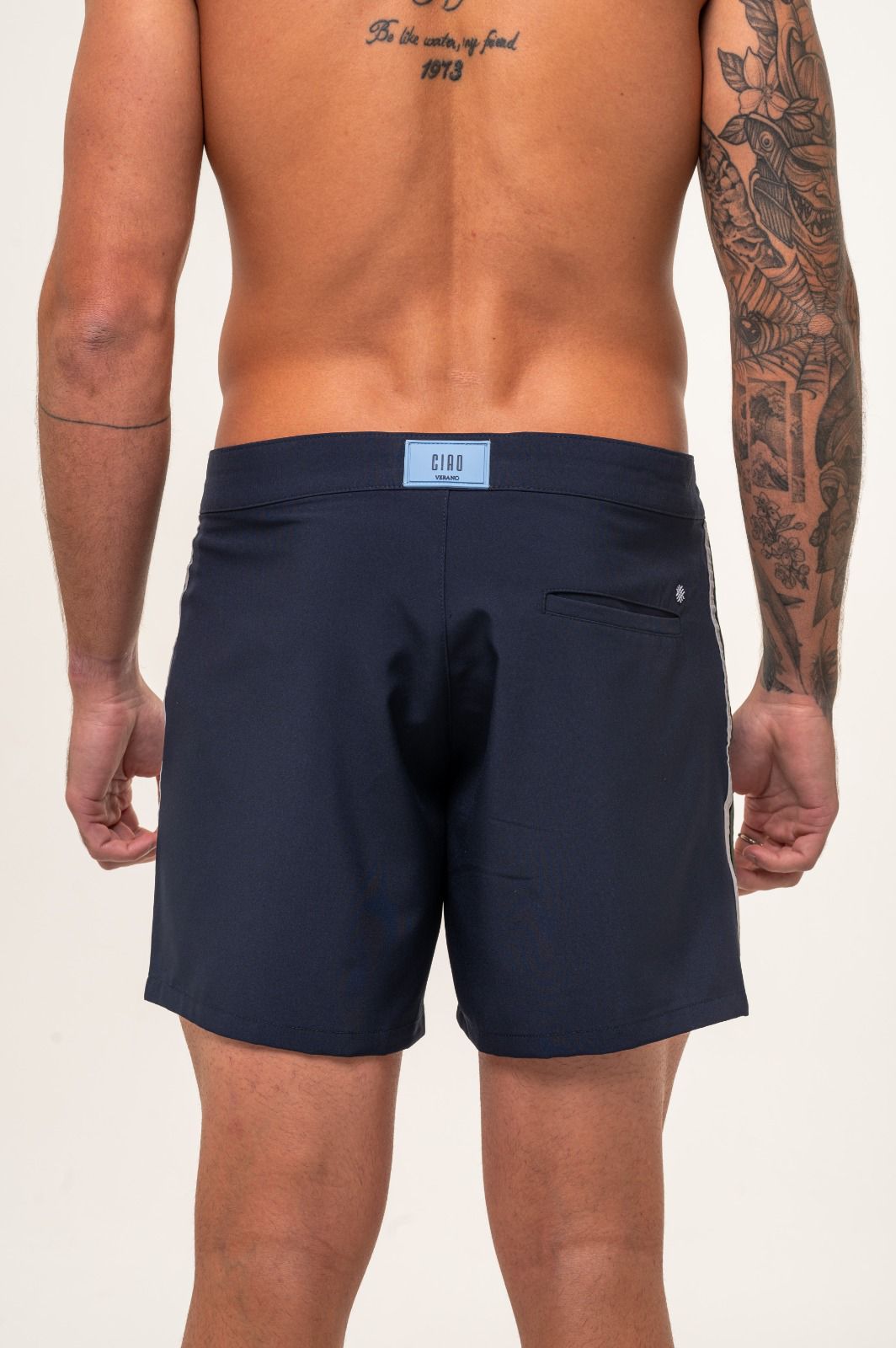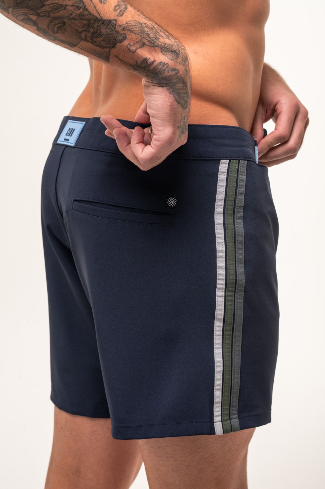 O Short Malibu une conforto, estilo e personalidade na medida certa. Em tom azul marinho, ele ganha destaque com as listras laterais em cinza, verde e chumbo que trazem um toque moderno e esportivo à peça.