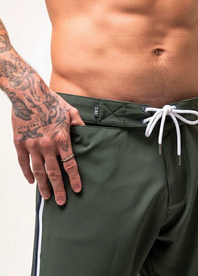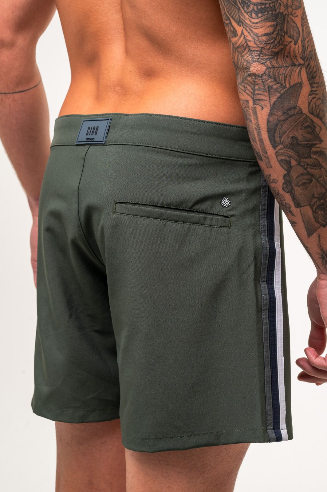 O Short Malibu une conforto, estilo e personalidade na medida certa. Em tom de verde, ele ganha destaque com as listras laterais em branco, azul marinho e chumbo que trazem um toque moderno e esportivo à peça.
